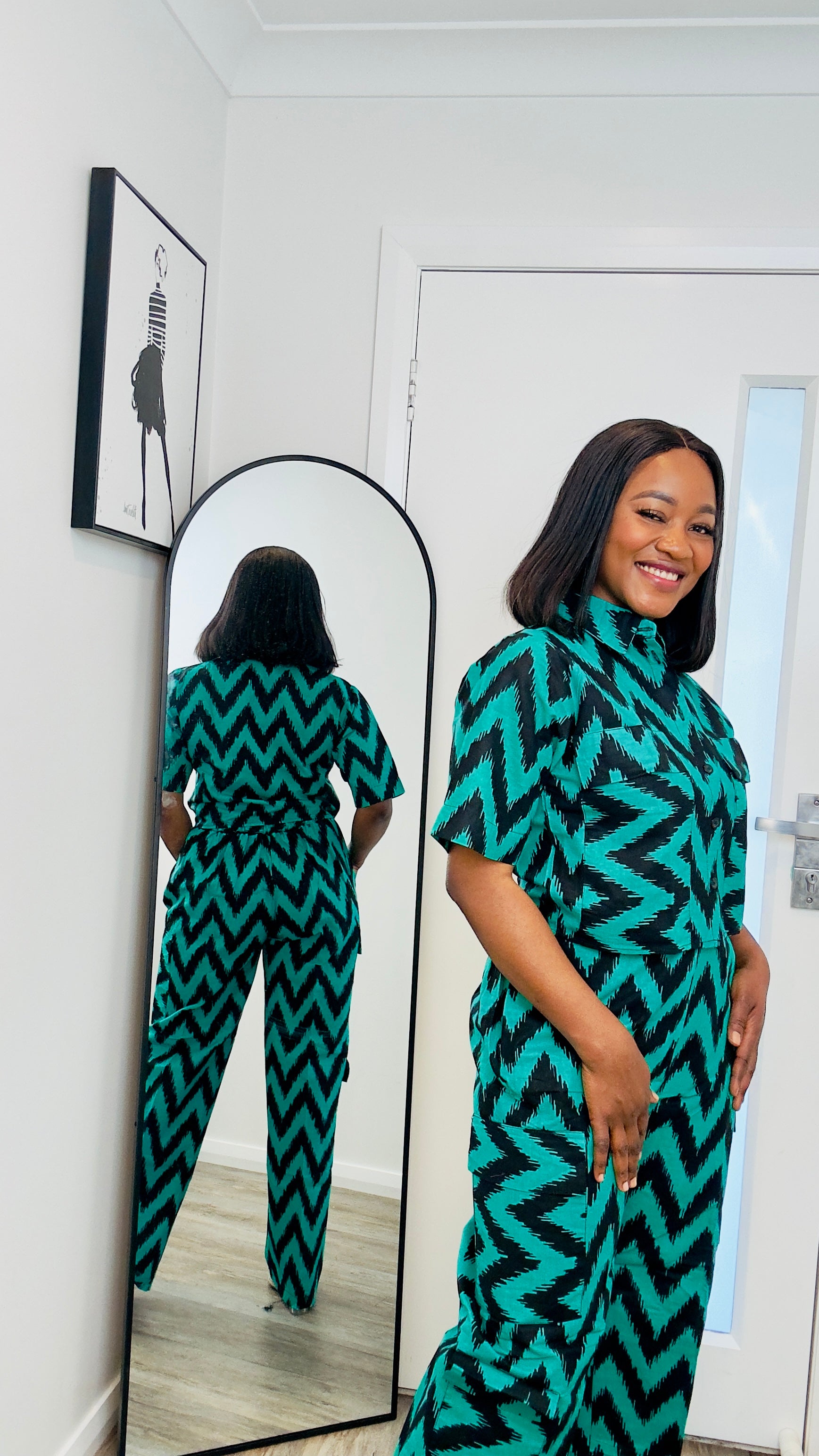 Made with 100% cotton Ankara, the Ire Cargo Pants Set is perfect for those looking for comfort and style. The cargo-pants style and cropped top add a trendy touch to this set. At a length of 44", the pants can be easily tailored to your desired length.